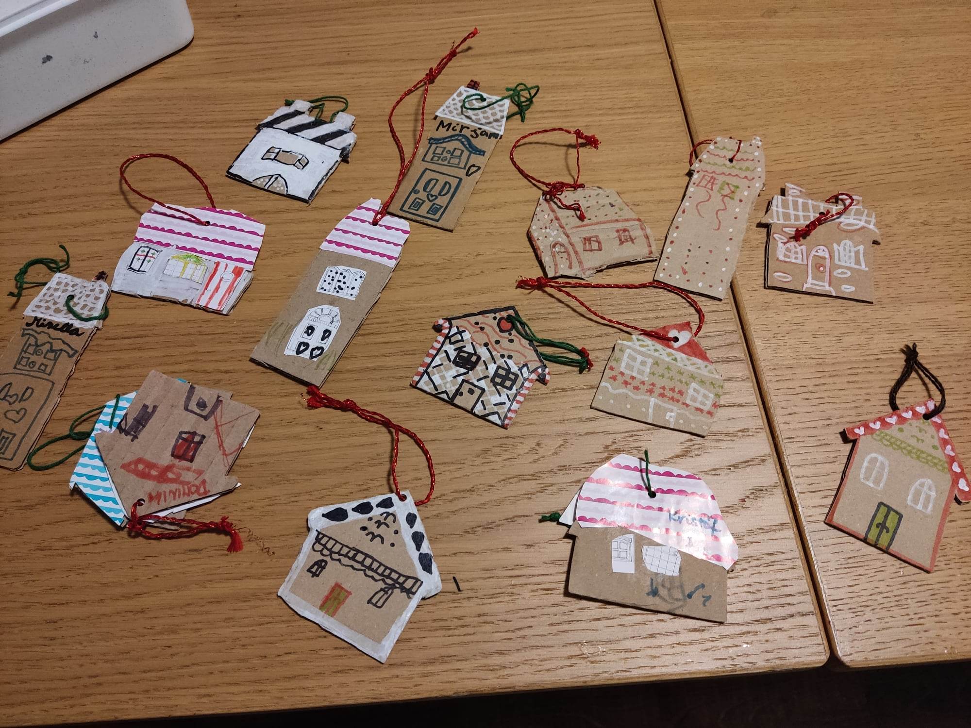 De nem csak sütöttünk, rajzoltunk is mézeskalácsokat! Dobozkartonból kivágott házakra a kötelező tető, ablak, ajtó mellett pöttyök, csíkok és szívek is kerültek. Meg kis akasztók is, hogy ezután karácsonyfákat vagy kilincseket díszíthessenek majd.