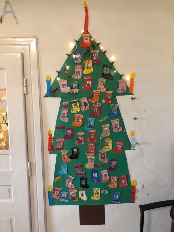 Első héten egy zoknit csináltunk, amire a sok-sok csicsa mellett a gyerekek saját fotója is felkerült. Ezt mindenki nagyon élvezte, azóta is a legváratlanabb helyekről kerülnek elő kis arany csillagok vagy piros karácsonyfák.