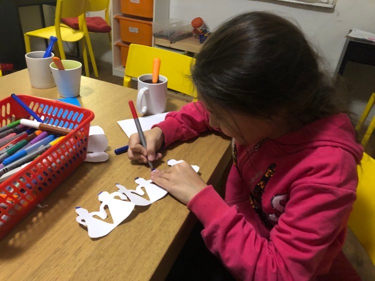 Harmadik hétre már tényleg alig maradt hely, így belekezdtünk a tanoda további dekorálásába. A bejárati ajtóhoz papírgirlandokat készítettünk. Egymás kezét fogó angyalkák, hóemberek, karácsonyfák és rénszarvasok sokasága díszíti az ajtónkat, ők fogadják majd a karácsonyi tanodázásra érkező gyerekeket. Nagyon készülünk rá, reméljük jól sikerül!
