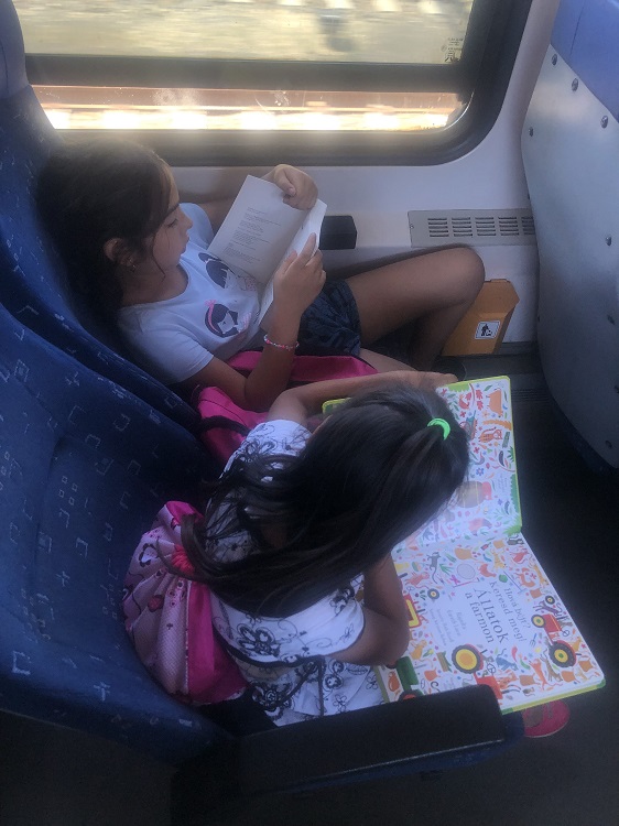 Elsőnek kocsival mentünk utána busszal és végül vonattal. Elmentünk a könyvesboltba és választhattunk kettő könyvet, amit szerettünk volna. Fagyiztunk, rágós és zöld almás fagyit ettünk.