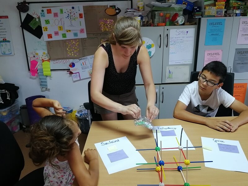 - Mutassuk be az első modellt, amit golyókból és pálcákból raktunk ki. Milyen alakja van? Mindenki fogja meg, nézze meg, hogy a golyók mennyire helyhez kötöttek. Beszéljük meg, hogy itt a golyók jelképezik a részecskéket.