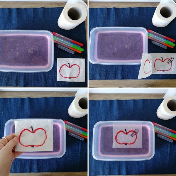 3. A félbehajtott vécépapír vagy papírzsepi külső oldalára az a rajz kerüljön, amit meg szeretnénk mutatni a többieknek (pl. egy alma vagy egy virág), belülre pedig ugyanez, csak egy kis változtatással (pl. ugyanez az alma egy kukaccal vagy ugyanez a virág kiszínezve). A rajzolásnál arra figyeljünk, hogy a két kép pontosan fedje egymást. Mi ehhez a második képpel kezdtünk, és utána ezt rajzoltuk át a külső oldalra.