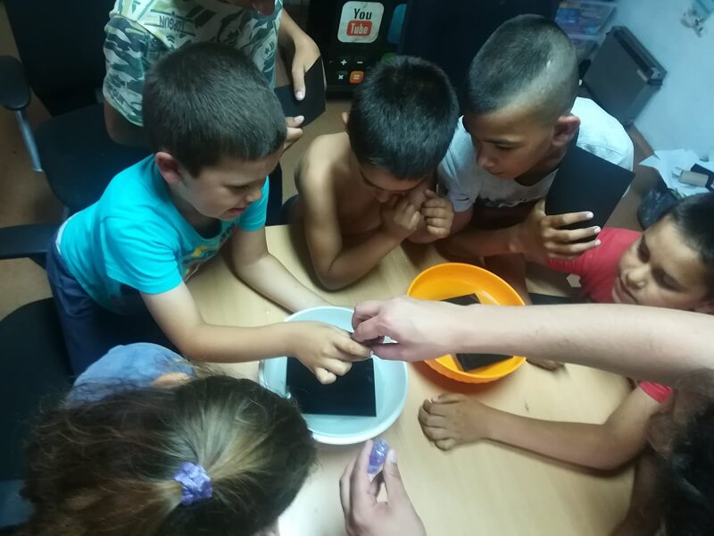 Töltsük meg a nagy tálat vízzel. Merítsük bele a fekete papírt a vízbe, nyomjuk le a tál aljára. Cseppentsünk a víz felszínére a körömlakkból, majd emeljük ki a papírt, és tegyük rá a tálcára száradni. A napra kitéve ez elég gyorsan megtörténik, és a természetes fényben különösen jól látszódik, milyen változatos minták jöttek létre a különböző lapokon, és hogyan változnak a színek a papírok mozgatásával.