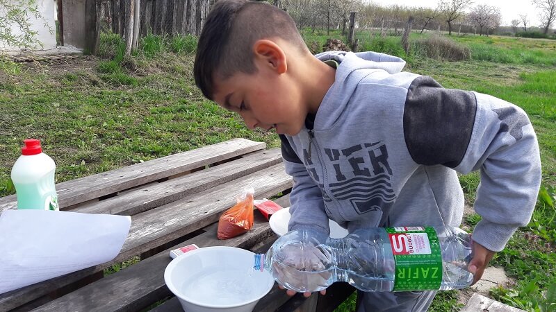 Töltsünk meg két tálat vízzel, majd az egyikbe szórunk borsot, a másikba paprikát. Kérjük meg a többieket, hogy mártsák bele ujjukat a tálba és beszéljük meg mi történt. Most jövünk mi. Titkosan nyomjunk az egyik ujjunkra mosogatószert, majd mártsuk bele az ujjunkat a tálba. Beszéljük meg mi történt, de még ne áruljuk el mi történt az előbb, mutassuk be a másik kísérletet is!