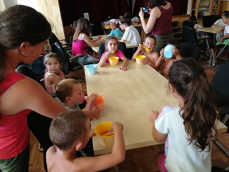 A locsolásért, gazolásért és szüretért minden héten más gyerekcsapat volt a felelős. A munka elhúzódott természetesen a nyári táborainkba, és megtermelt javakat egy közös családi pikniken tálaltuk fel.